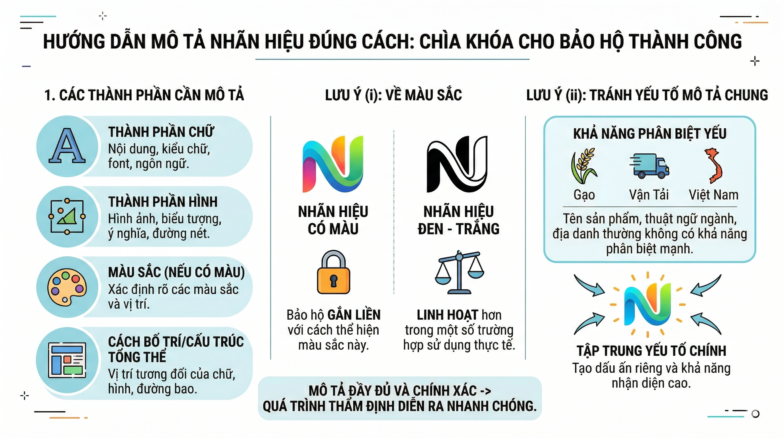 Việc mô tả nhãn hiệu đầy đủ và chính xác ngay từ đầu sẽ giúp quá trình thẩm định diễn ra thuận lợi hơn và hạn chế yêu cầu sửa đổi hồ sơ trong quá trình xử lý đơn.