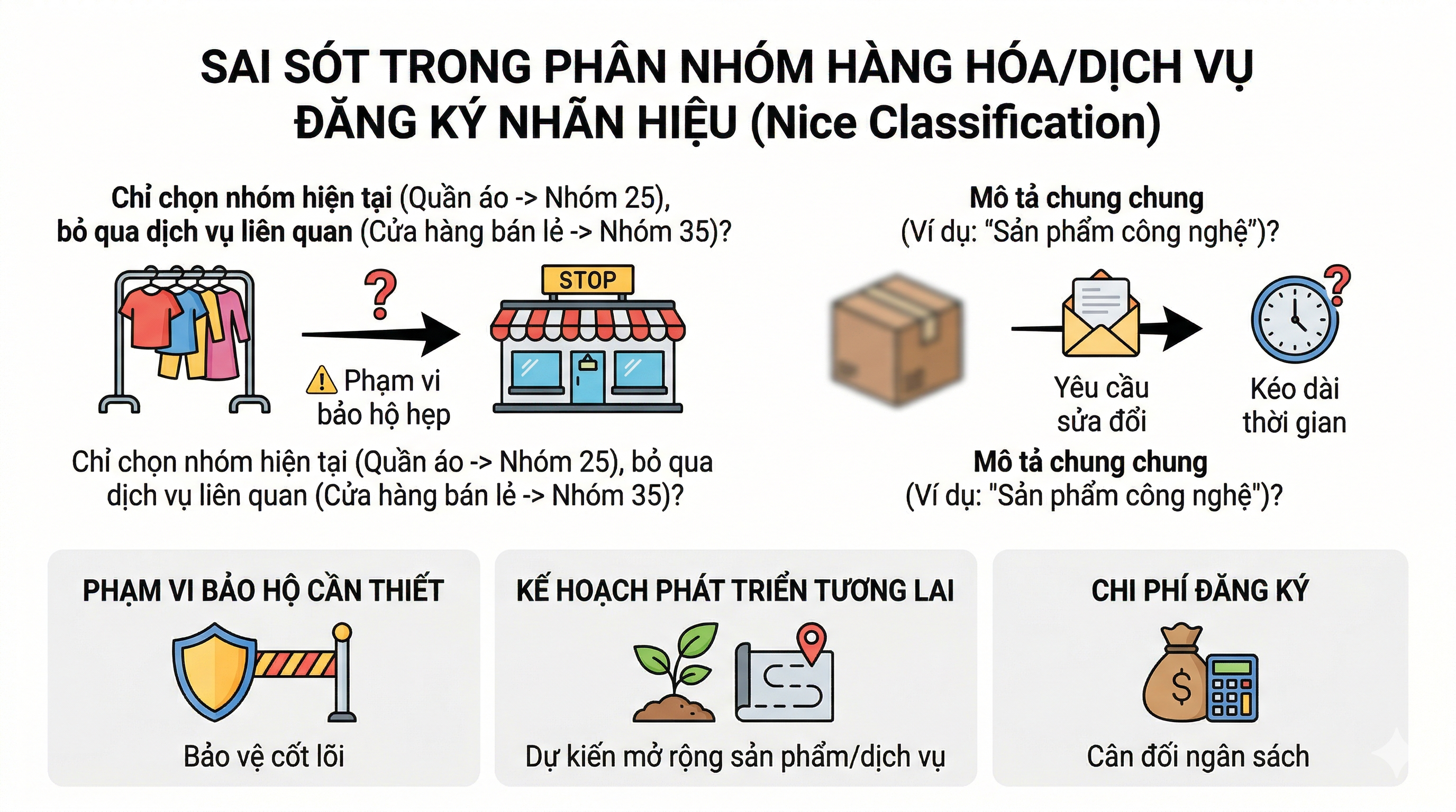 Ngoài ra, việc mô tả hàng hóa hoặc dịch vụ quá chung chung cũng có thể khiến cơ quan thẩm định yêu cầu sửa đổi hoặc phân loại lại, làm kéo dài thời gian xử lý đơn. Do đó, khi lựa chọn nhóm hàng hóa, dịch vụ, cần cân nhắc giữa: