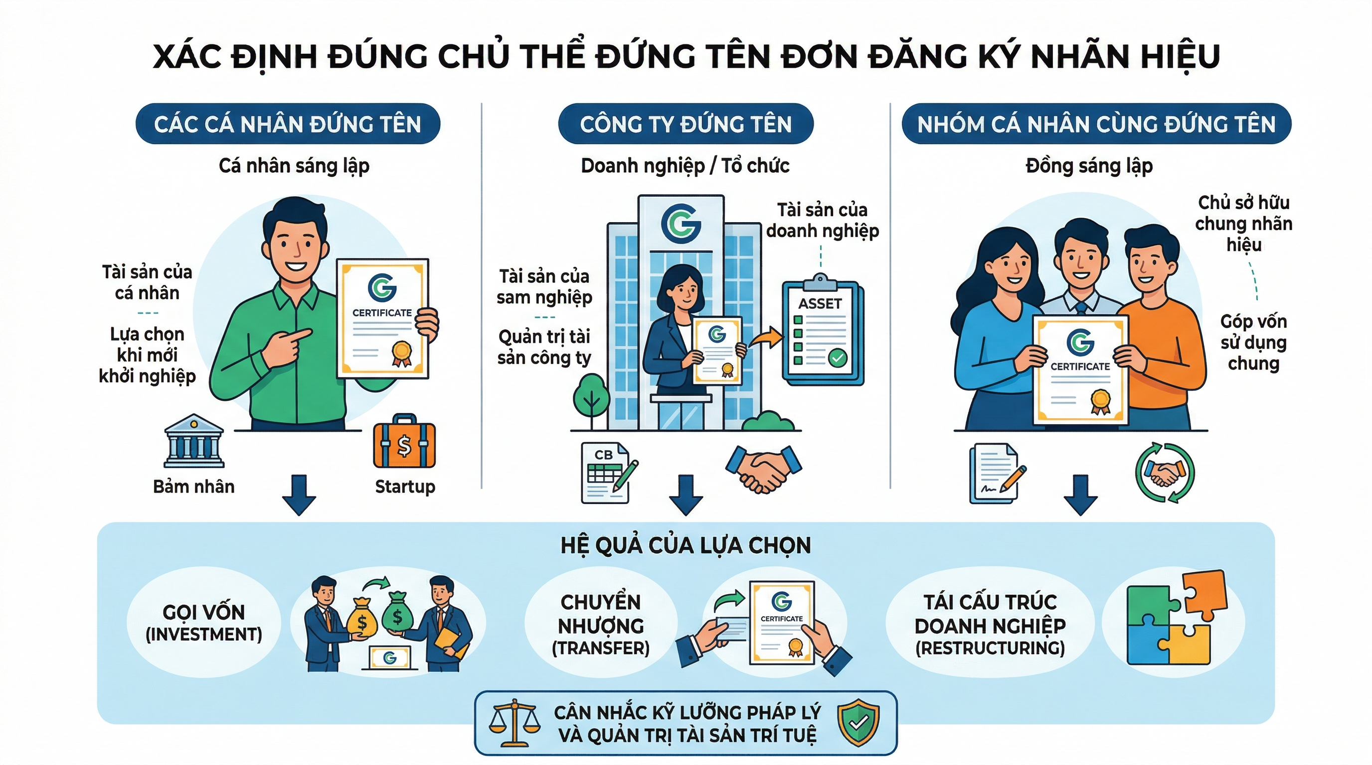 Việc lựa chọn chủ thể đứng tên cần được cân nhắc từ góc độ pháp lý và quản trị tài sản trí tuệ.