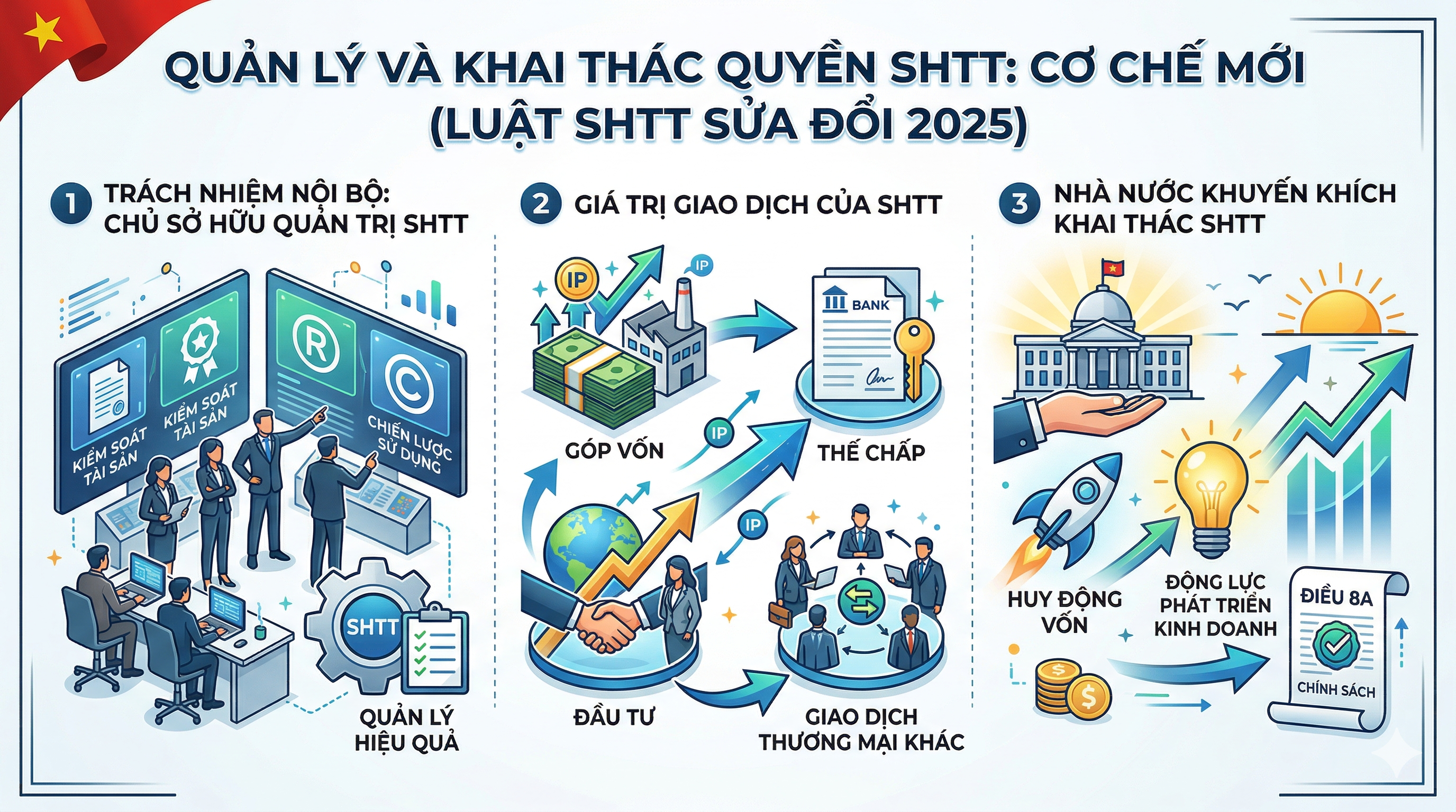Luật Sở hữu trí tuệ sửa đổi 2025 bổ sung Điều 8a, xác lập khung pháp lý trực tiếp cho việc quản lý và khai thác và thương mại hoá quyền SHTT: