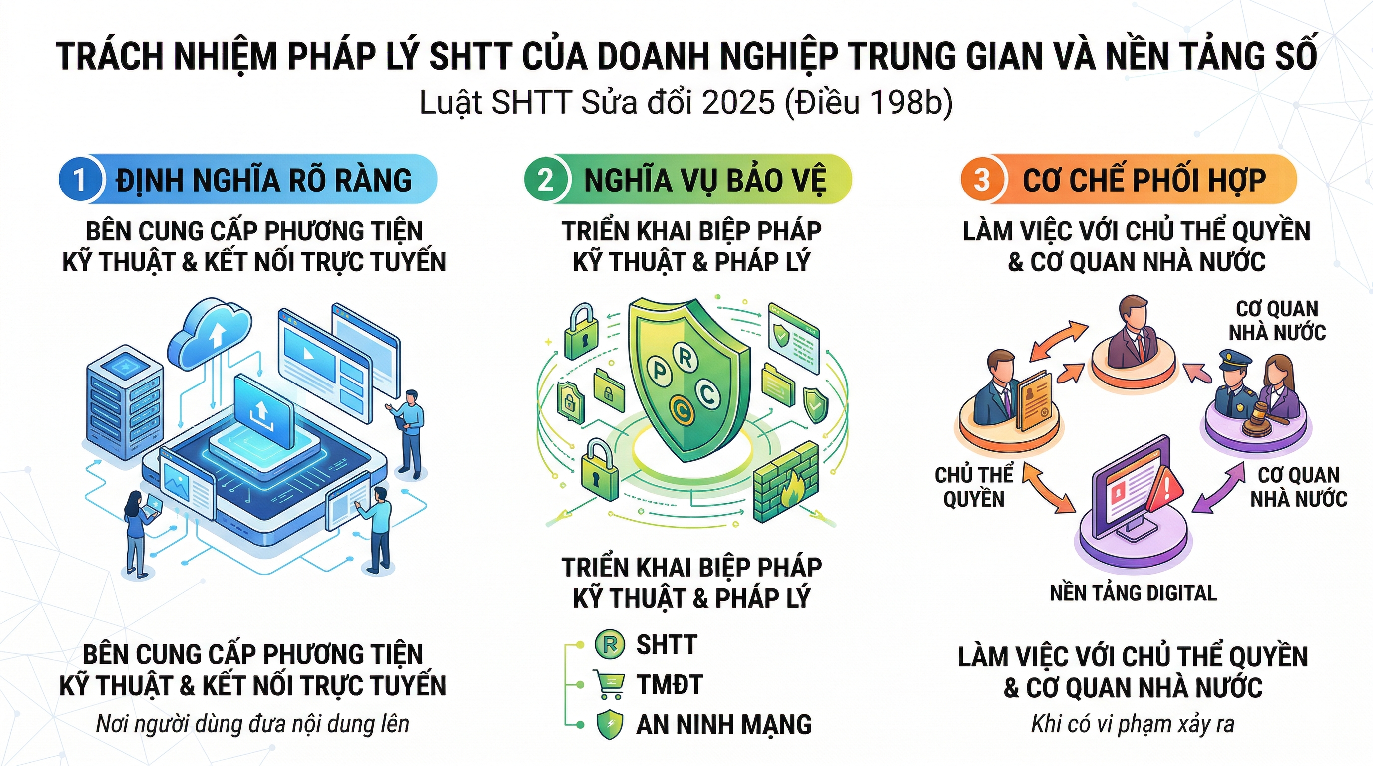 - Nghĩa vụ bảo vệ: Chủ quản nền tảng số phải triển khai các biện pháp kỹ thuật và pháp lý (theo quy định pháp luật về SHTT, TMĐT, An ninh mạng) để bảo vệ quyền SHTT trên không gian mạng.