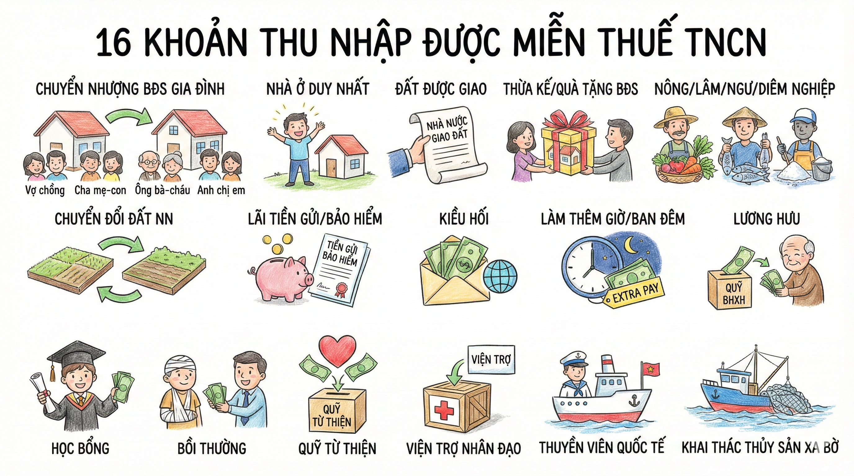 Theo Điều 4 Luật Thuế thu nhập cá nhân 2007, đã được sửa đổi, bổ sung qua các năm, hiện nay có 16 khoản thu nhập được miễn thuế TNCN, bao gồm: