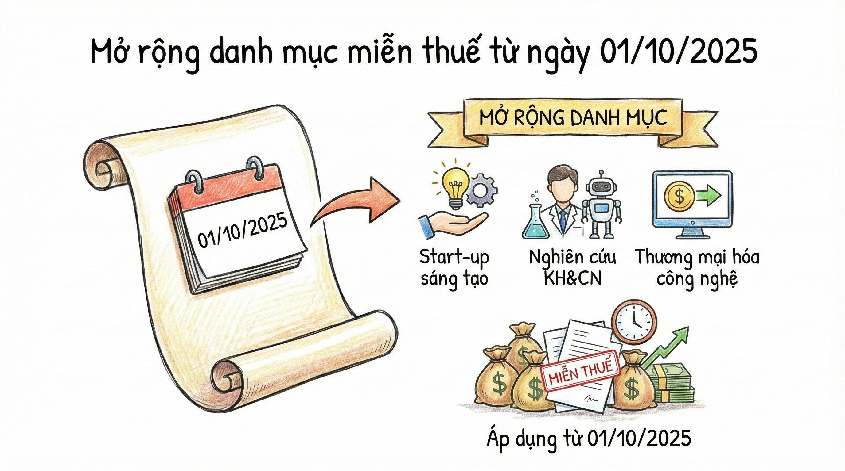 Theo khoản 3 Điều 71 Luật Khoa học, Công nghệ và Đổi mới sáng tạo 2025 (có hiệu lực từ ngày 01/10/2025), danh mục miễn thuế thu nhập cá nhân được bổ sung thêm 03 khoản, gồm:
