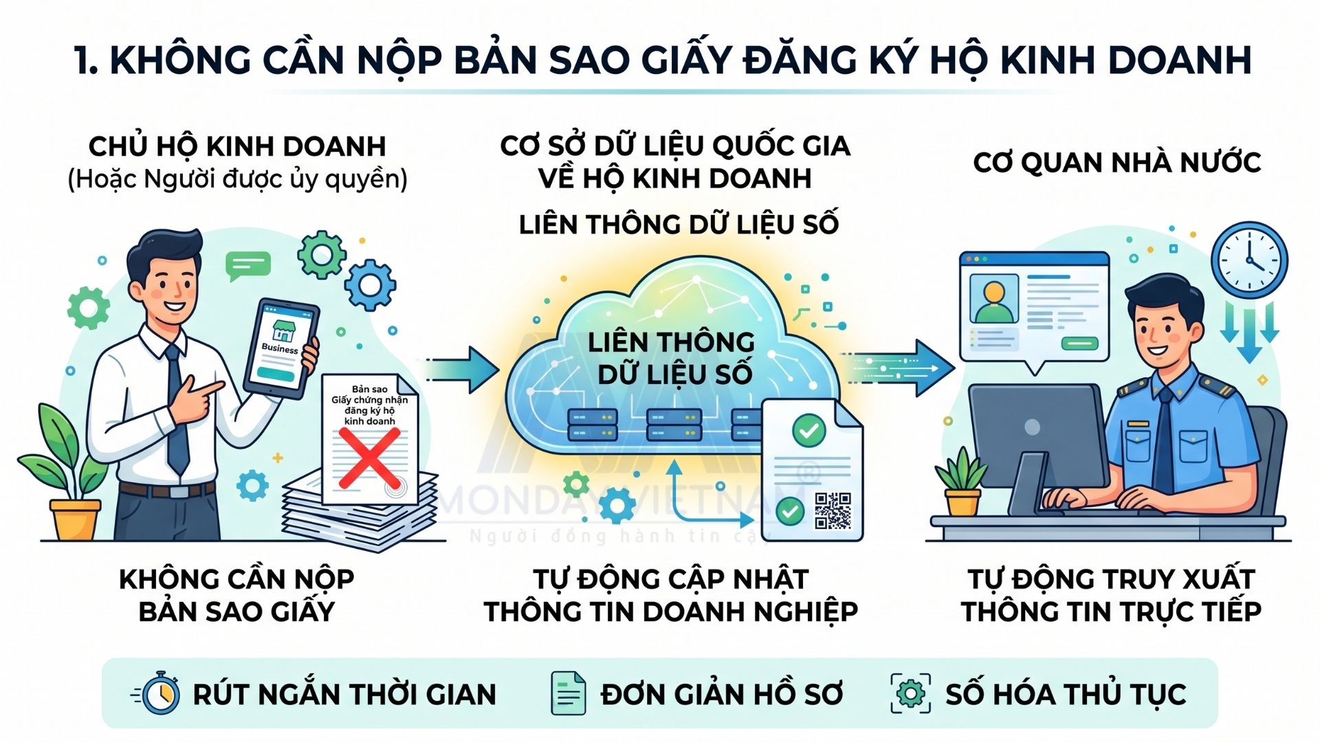 Cụ thể, khi thực hiện các thủ tục hành chính, chủ hộ kinh doanh (hoặc người được ủy quyền hợp pháp) không cần nộp bản sao Giấy chứng nhận đăng ký hộ kinh doanh. Thay vào đó, các cơ quan nhà nước sẽ tự động truy xuất thông tin trực tiếp từ Cơ sở dữ liệu quốc gia về hộ kinh doanh. Sự liên thông dữ liệu số này giúp rút ngắn đáng kể thời gian chuẩn bị hồ sơ cho người dân.