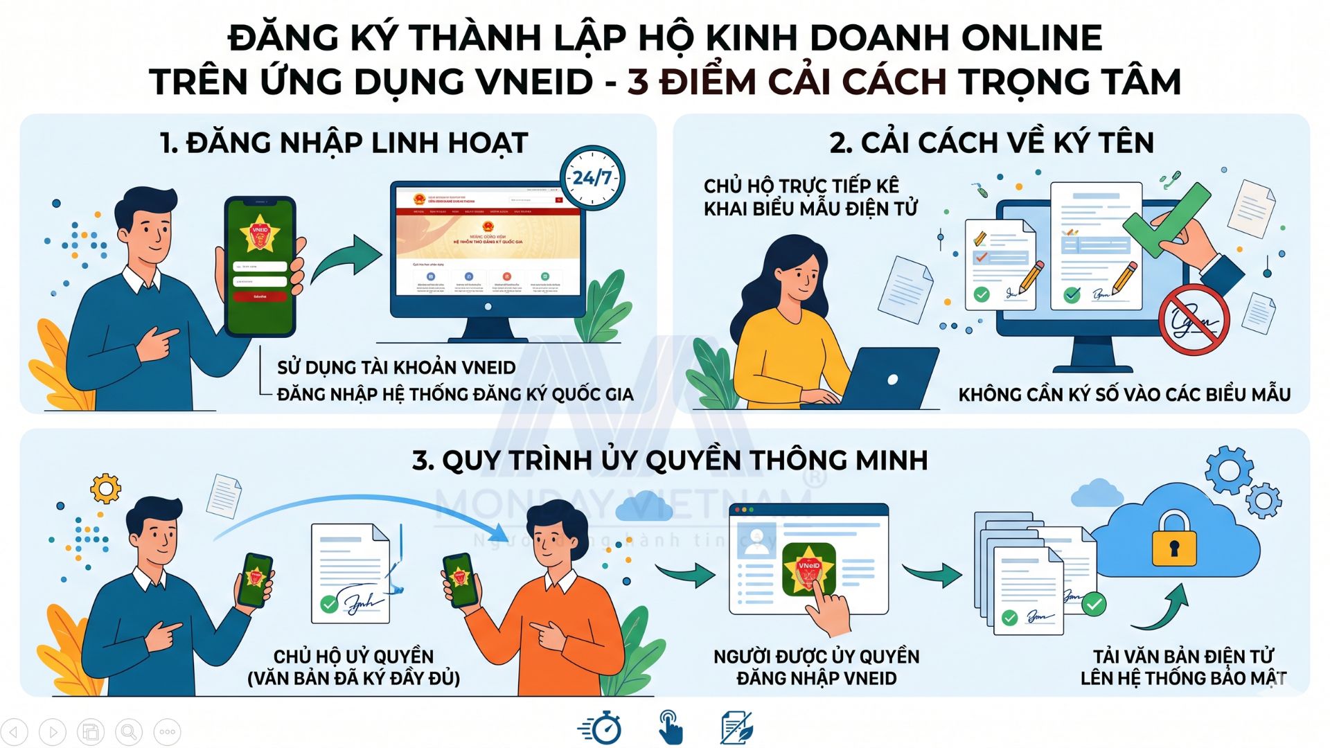 Sự ra đời của chính sách mới là cơ hội để các cá nhân khởi nghiệp dễ dàng hơn. MONDAY VIETNAM khuyến nghị các chủ Hộ kinh doanh tương lai nên sớm cập nhật và định danh tài khoản trên VNeID để sẵn sàng áp dụng quy trình hiện đại này.