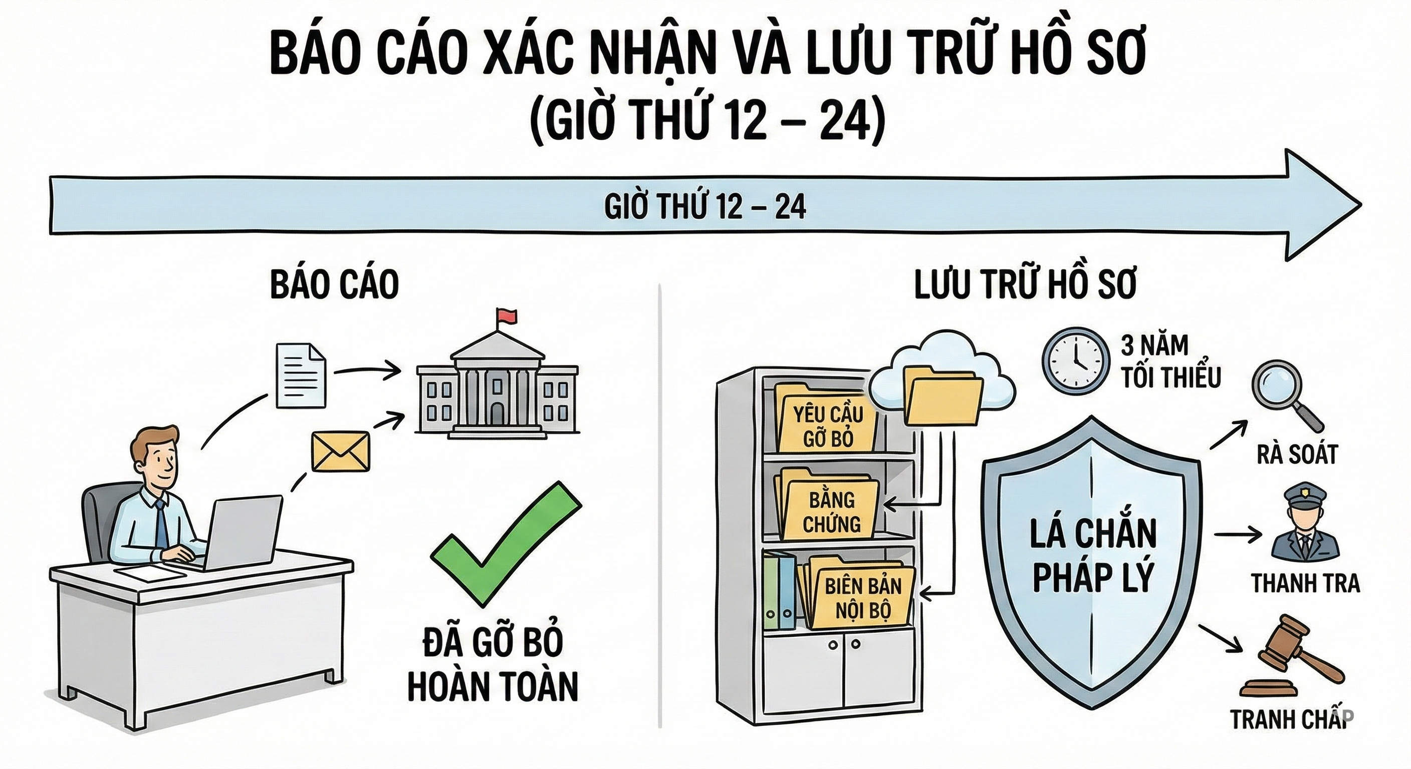 Song song với việc báo cáo, toàn bộ hồ sơ của vụ việc phải được tập hợp và lưu trữ có hệ thống để phục vụ công tác kiểm tra, thanh tra về sau. Hồ sơ cần thể hiện đầy đủ quá trình xử lý, từ yêu cầu gỡ bỏ của cơ quan chức năng, bằng chứng chứng minh nội dung đã được tháo gỡ, đến biên bản xử lý nội bộ của doanh nghiệp. Theo yêu cầu tuân thủ, thời hạn lưu trữ tối thiểu là 03 năm trong hệ thống lưu trữ bắt buộc.