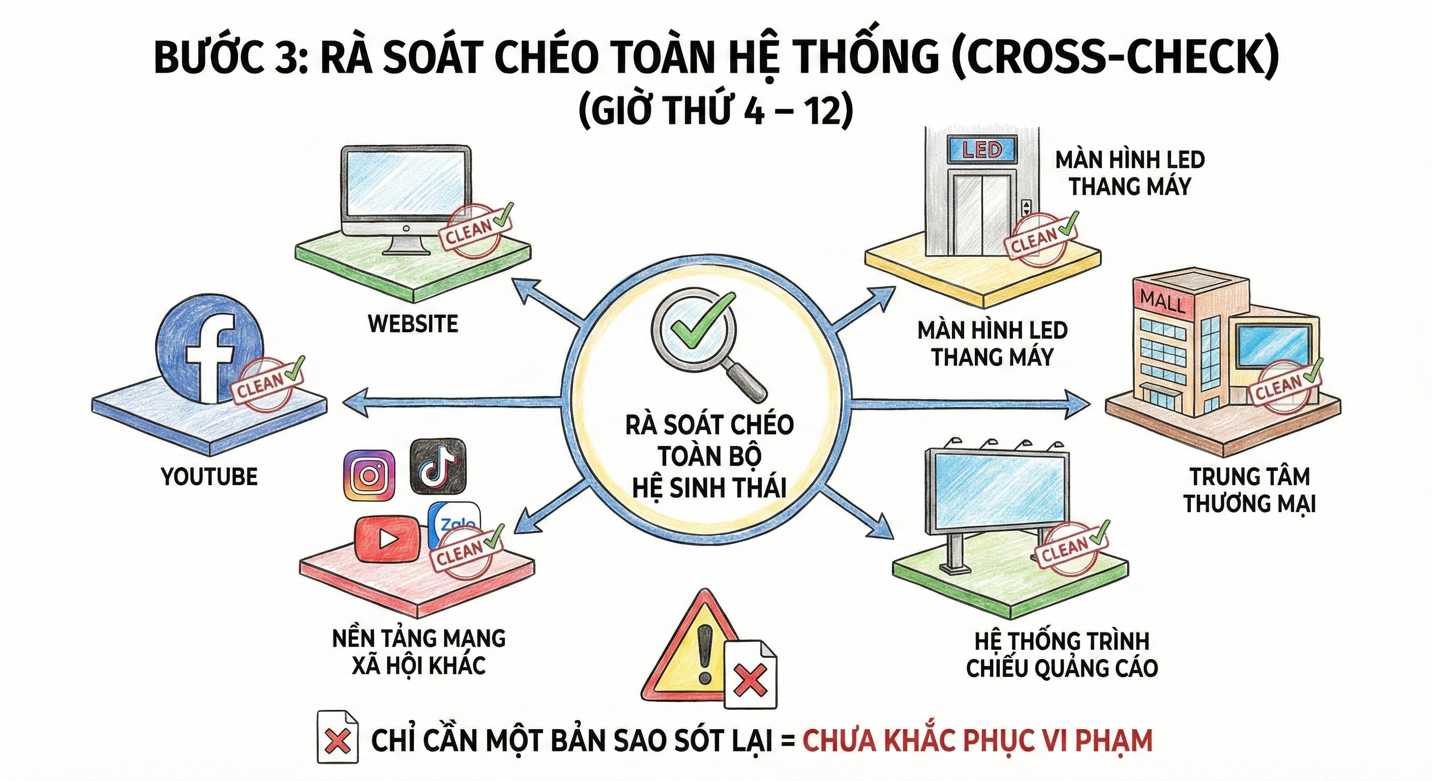 Việc kiểm tra phải bao phủ tất cả các điểm chạm omnichannel như website, fanpage, YouTube, nền tảng mạng xã hội khác, cũng như các kênh offline có yếu tố số hóa như màn hình LED trong thang máy, trung tâm thương mại hoặc hệ thống trình chiếu quảng cáo. Chỉ cần một bản sao còn sót lại cũng có thể khiến doanh nghiệp tiếp tục bị xem là chưa khắc phục vi phạm.